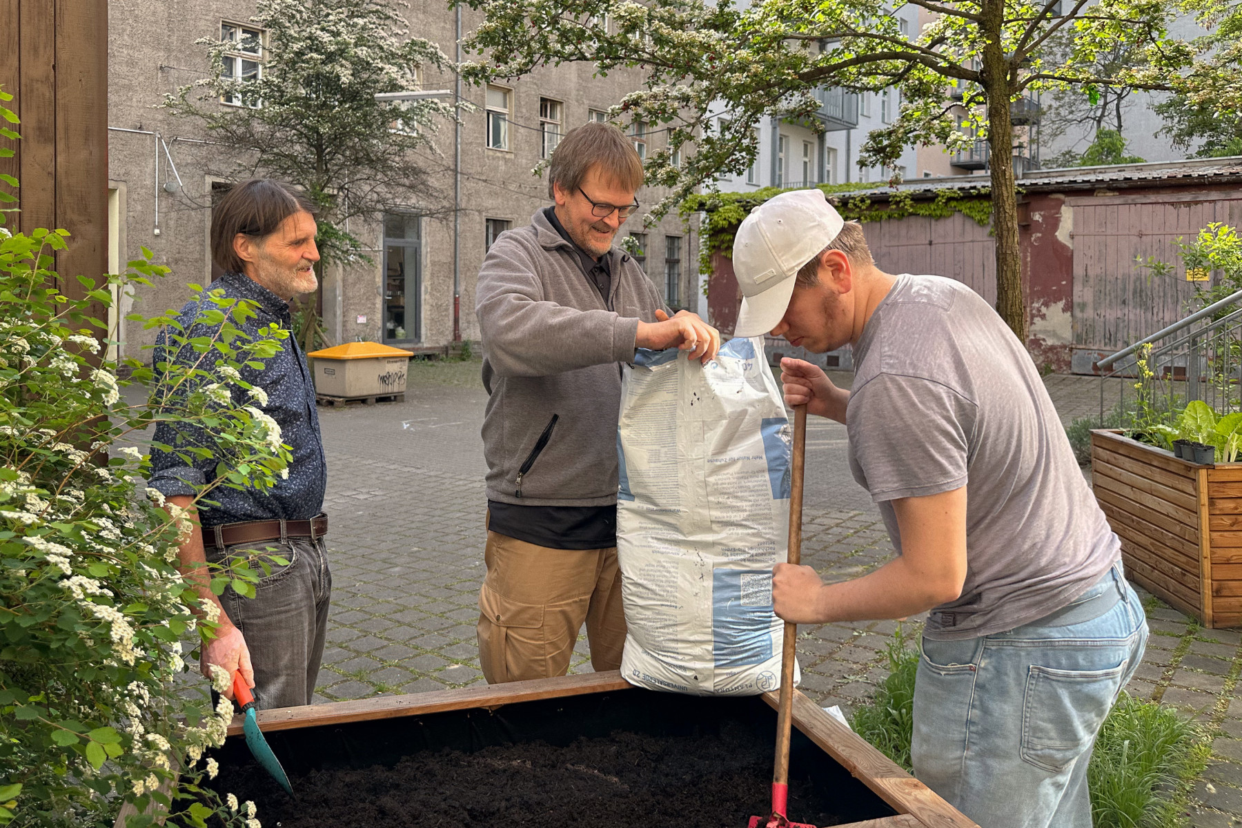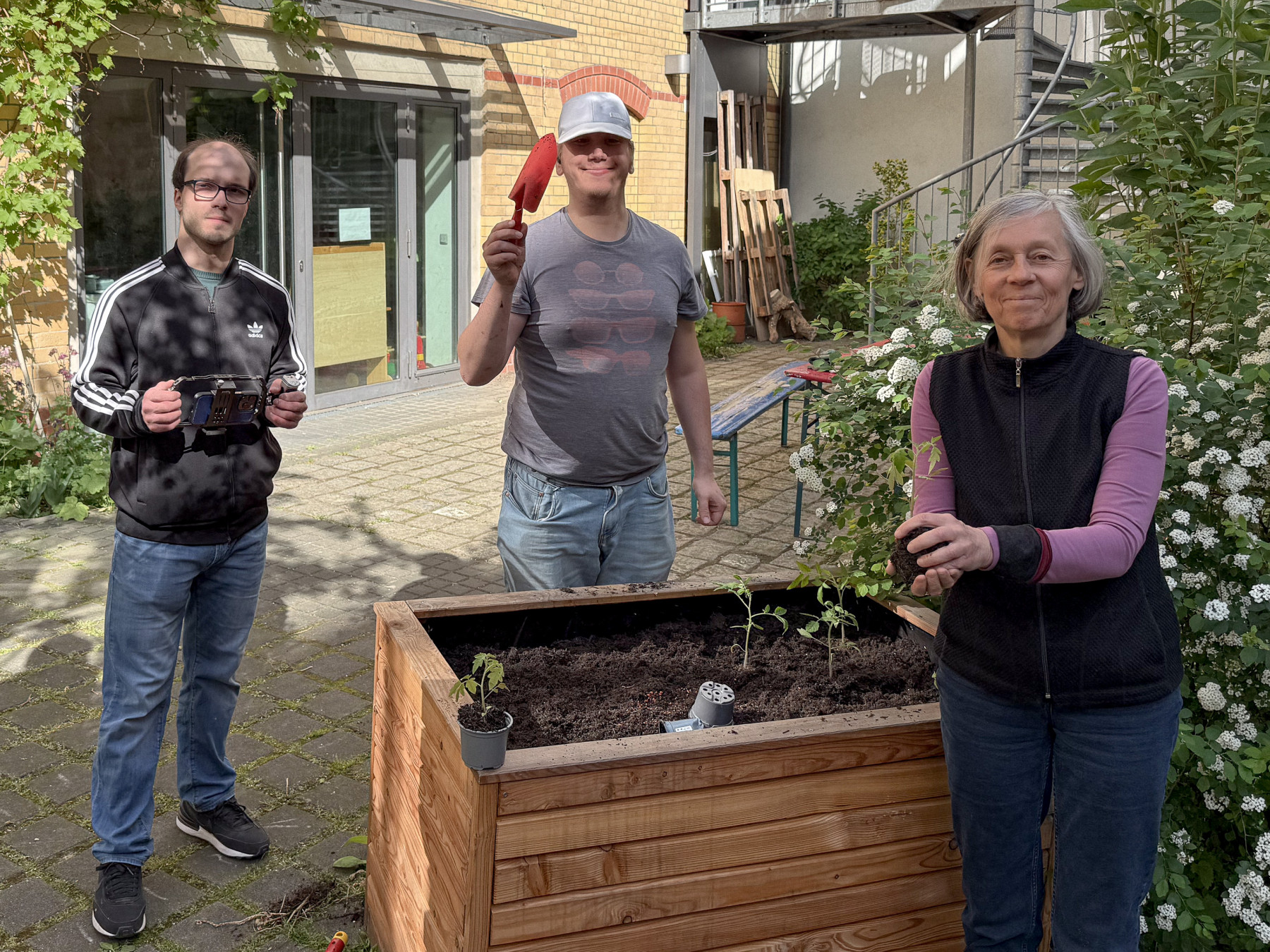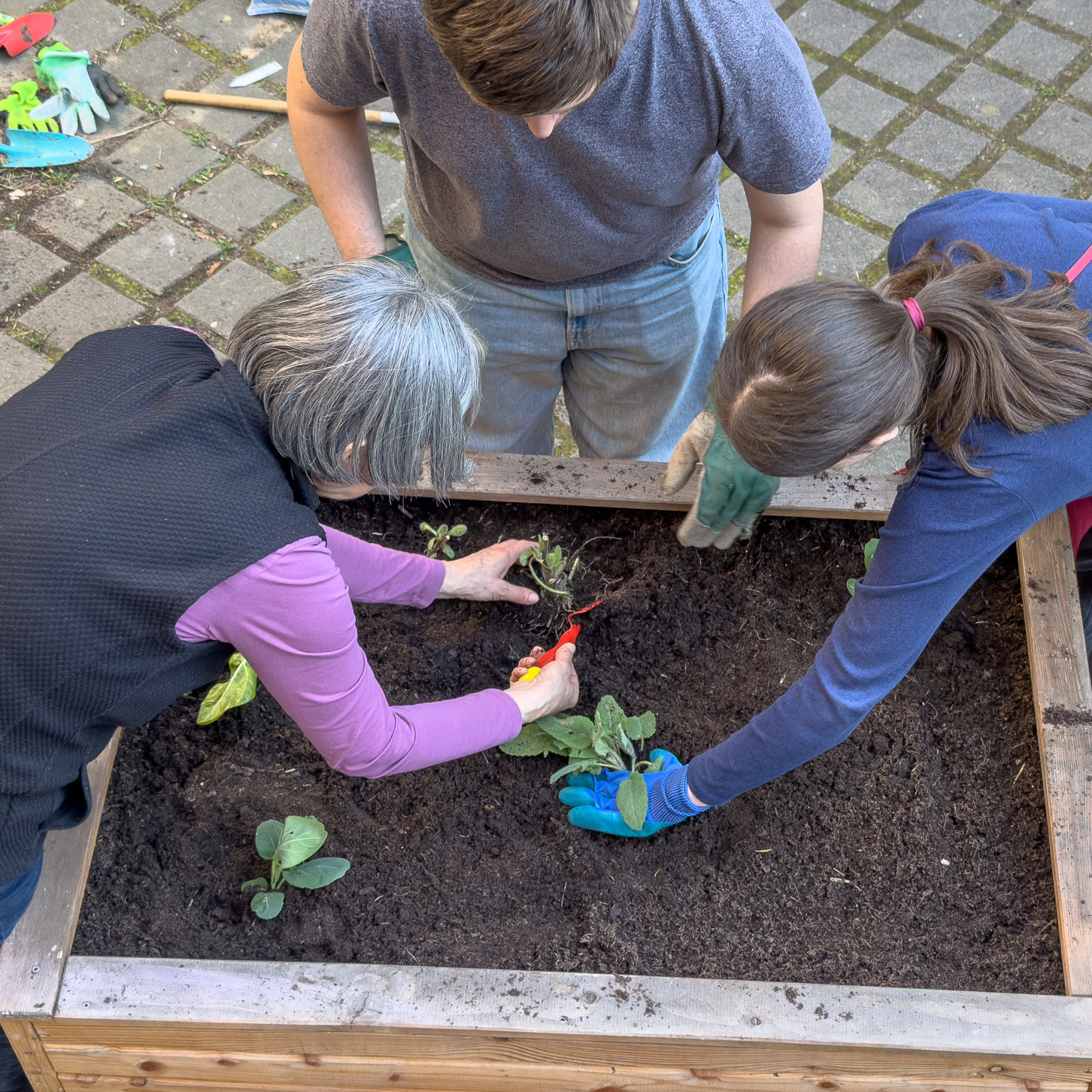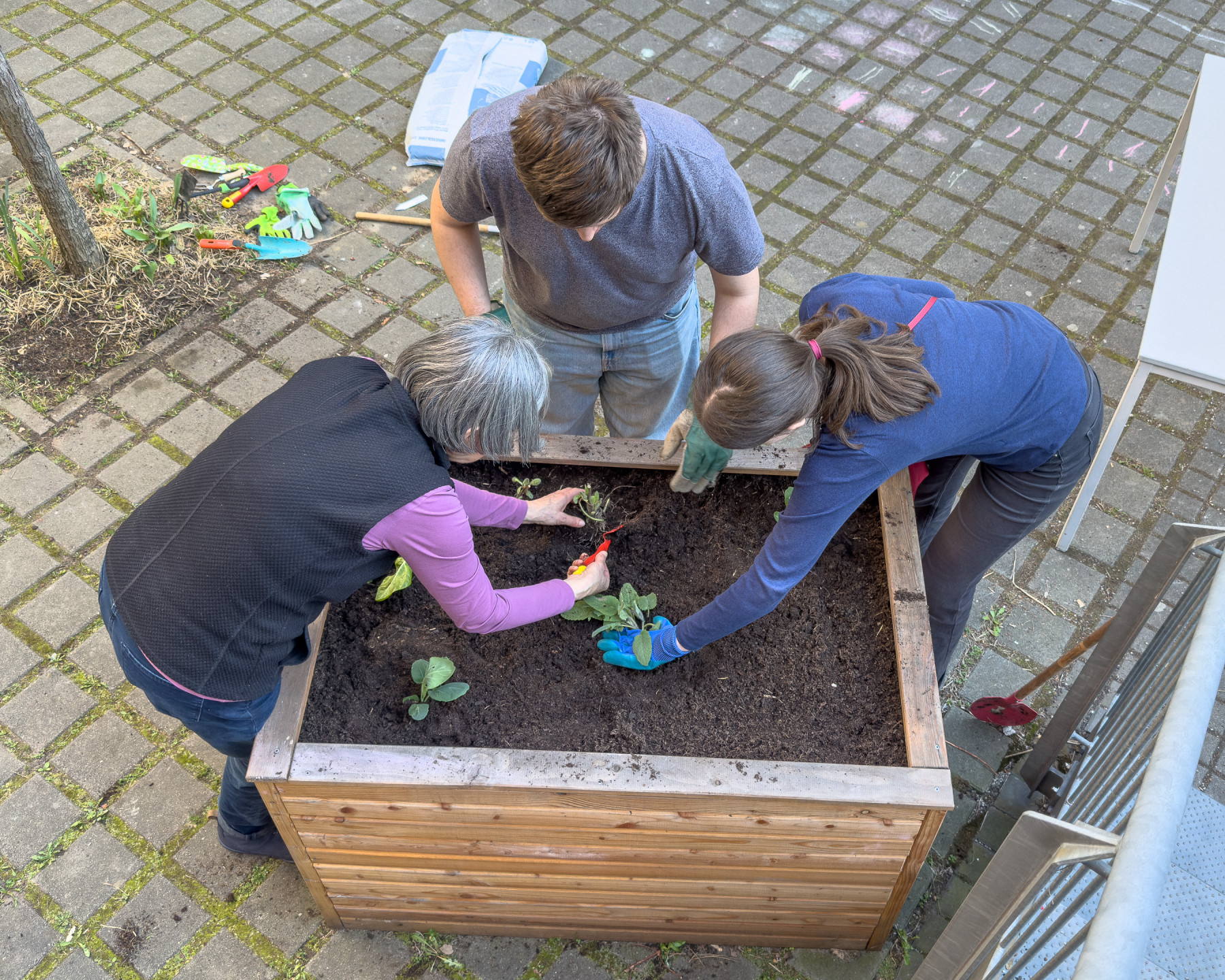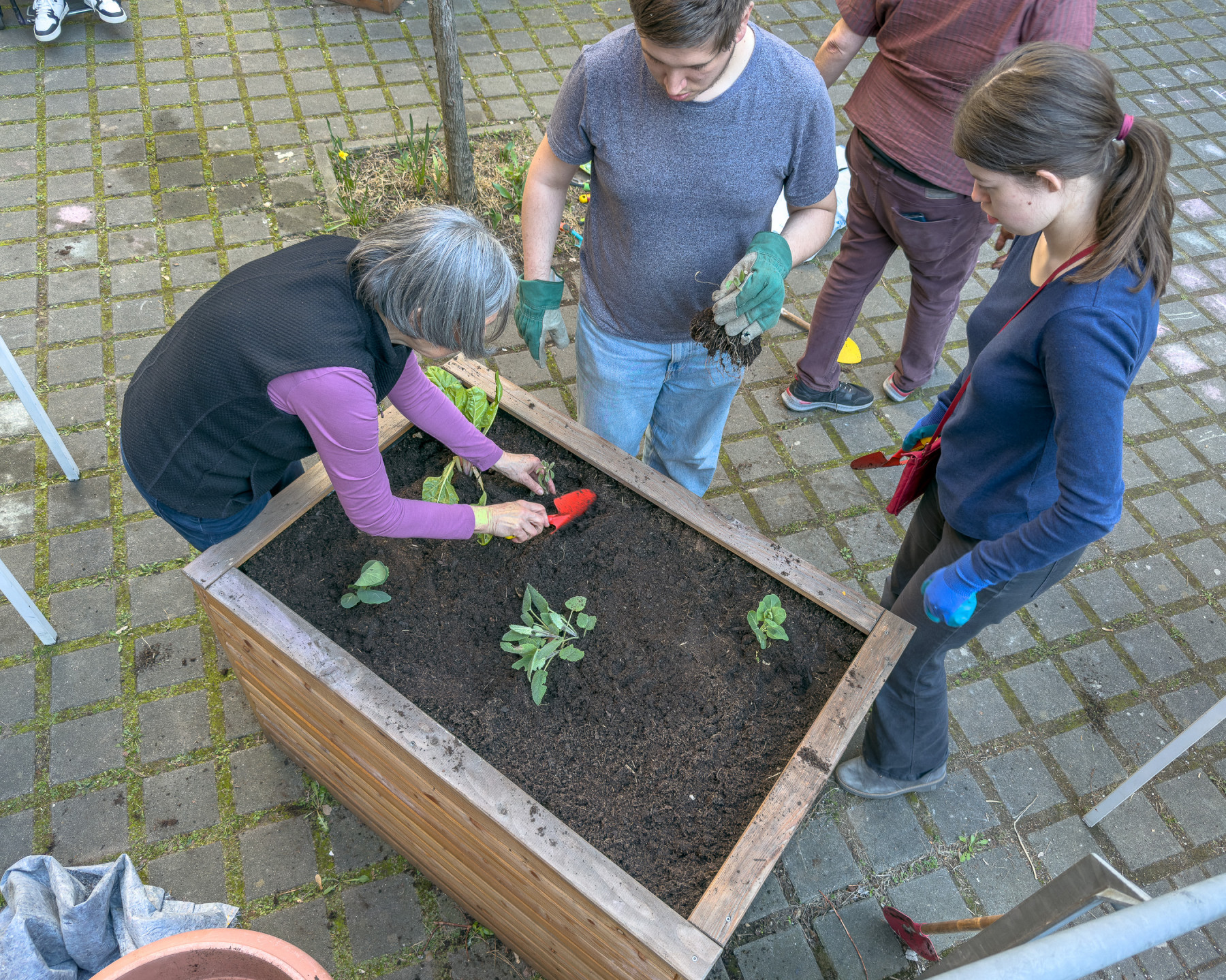 Wir bereiten die Hochbeete vor. Mehrjährige Pflanzen vorsichtig ausgraben, die Hochbeete mit neuer Erde auffüllen und die Planzen wieder einsetzen.