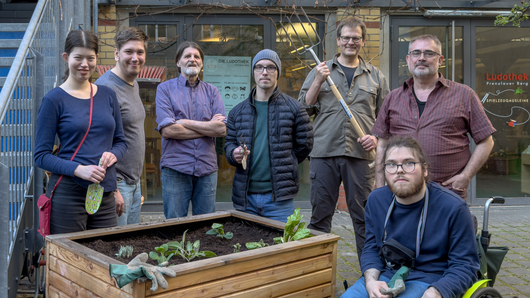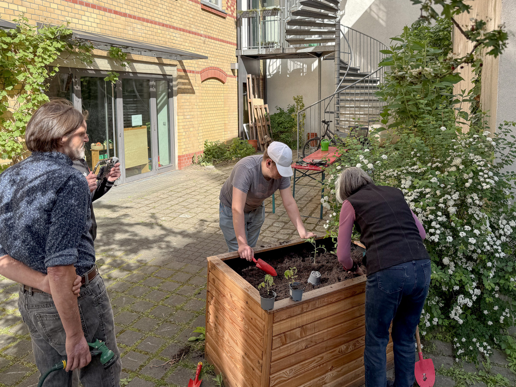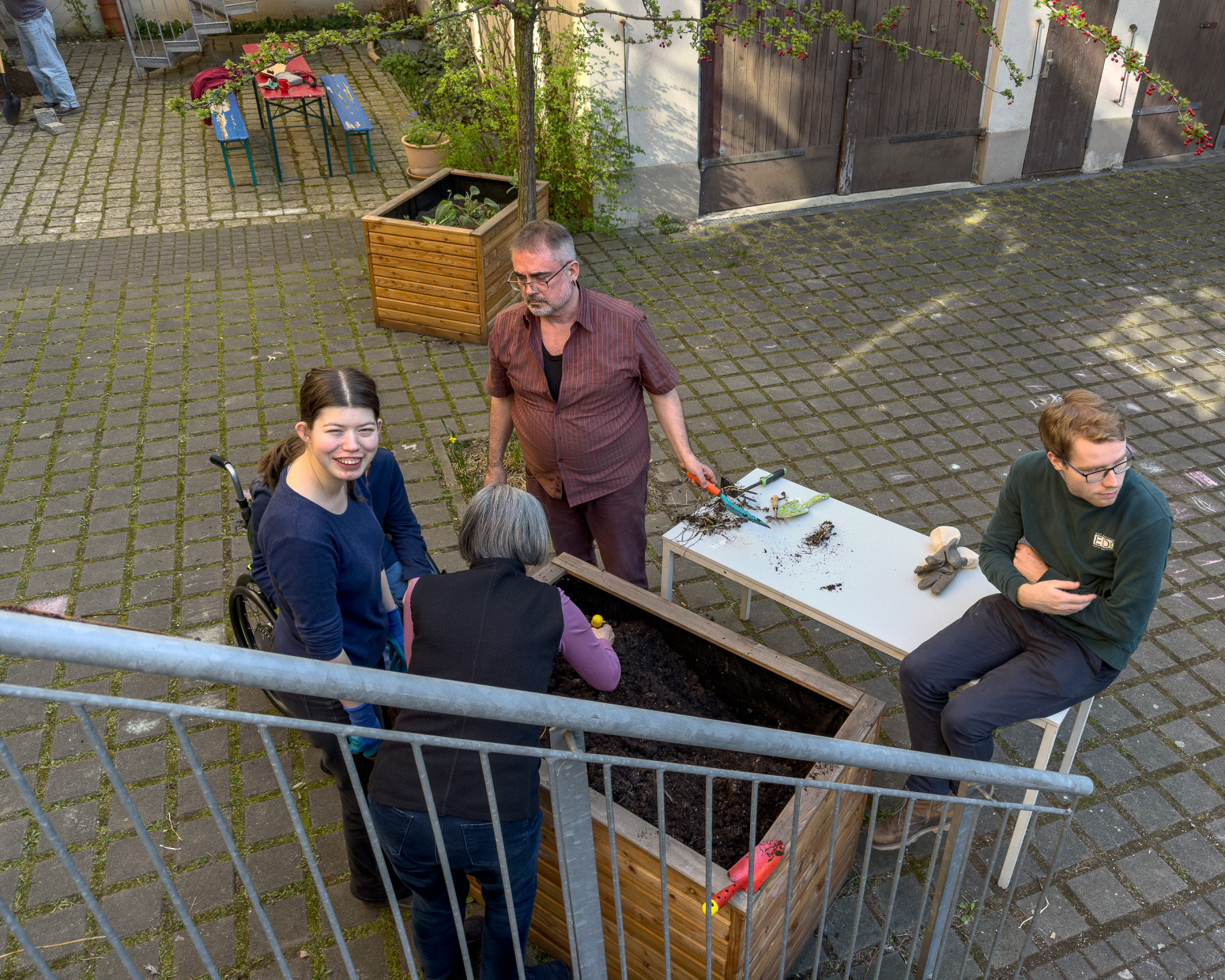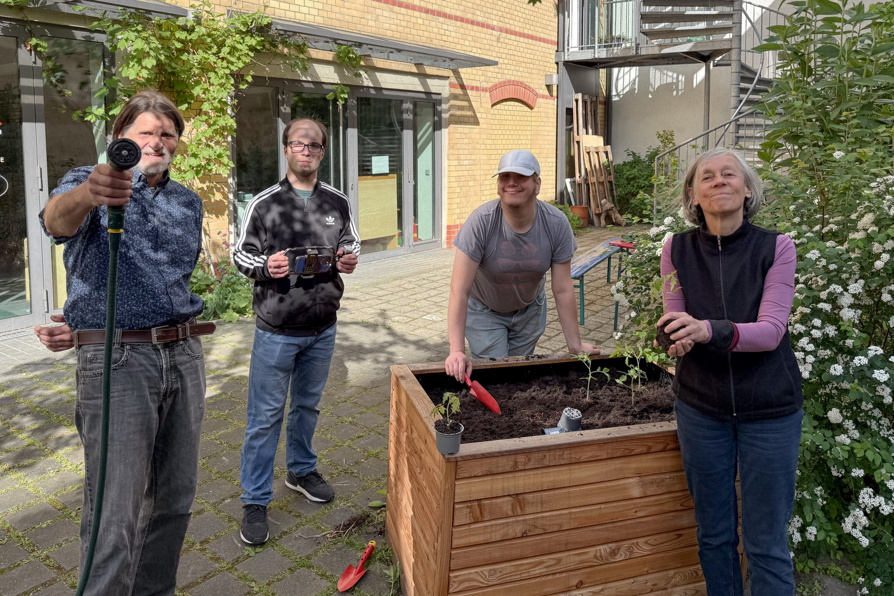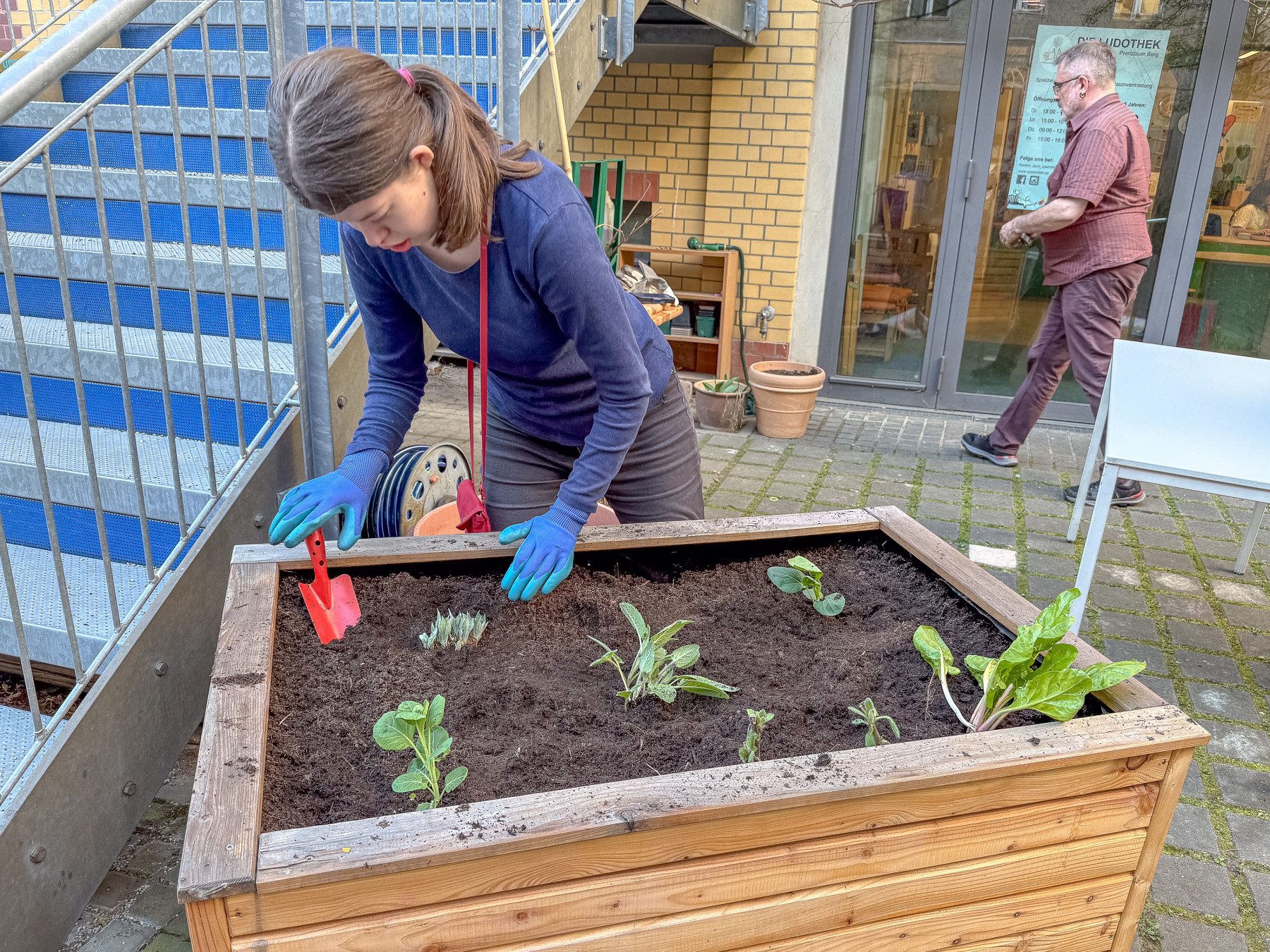 Wir bereiten die Hochbeete vor. Mehrjährige Pflanzen vorsichtig ausgraben, die Hochbeete mit neuer Erde auffüllen und die Planzen wieder einsetzen.