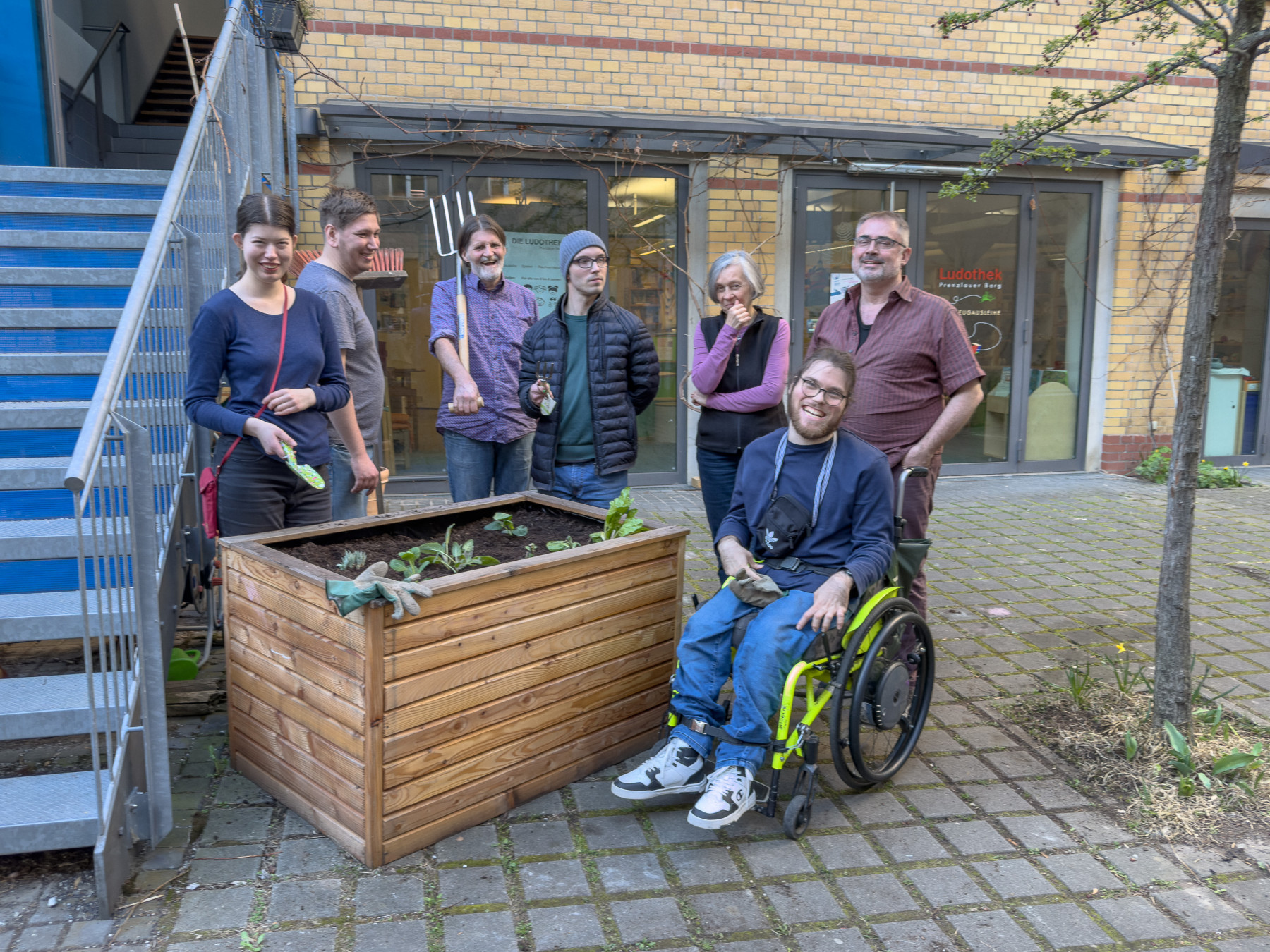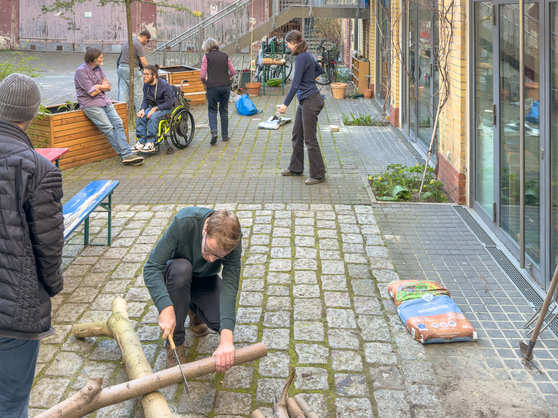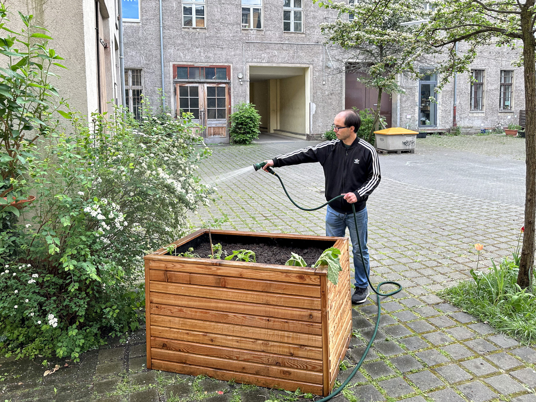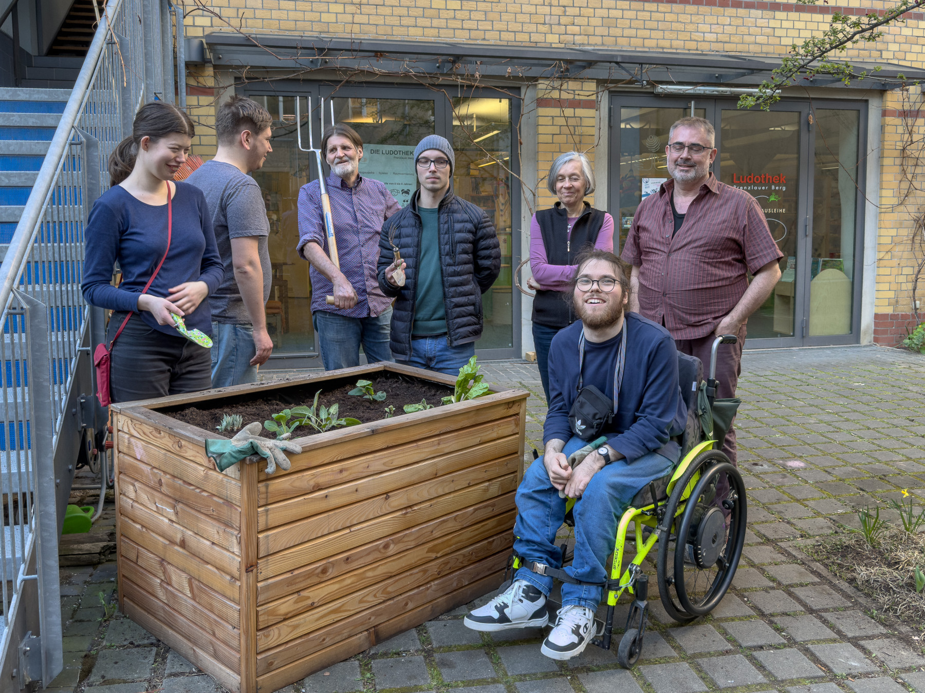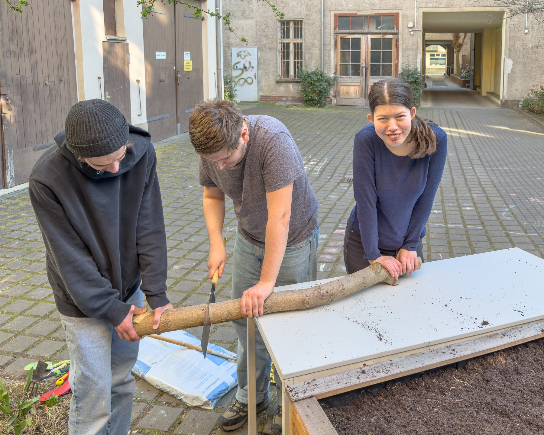 Wir bereiten die Hochbeete vor. Mehrjährige Pflanzen vorsichtig ausgraben, die Hochbeete mit neuer Erde auffüllen und die Planzen wieder einsetzen.