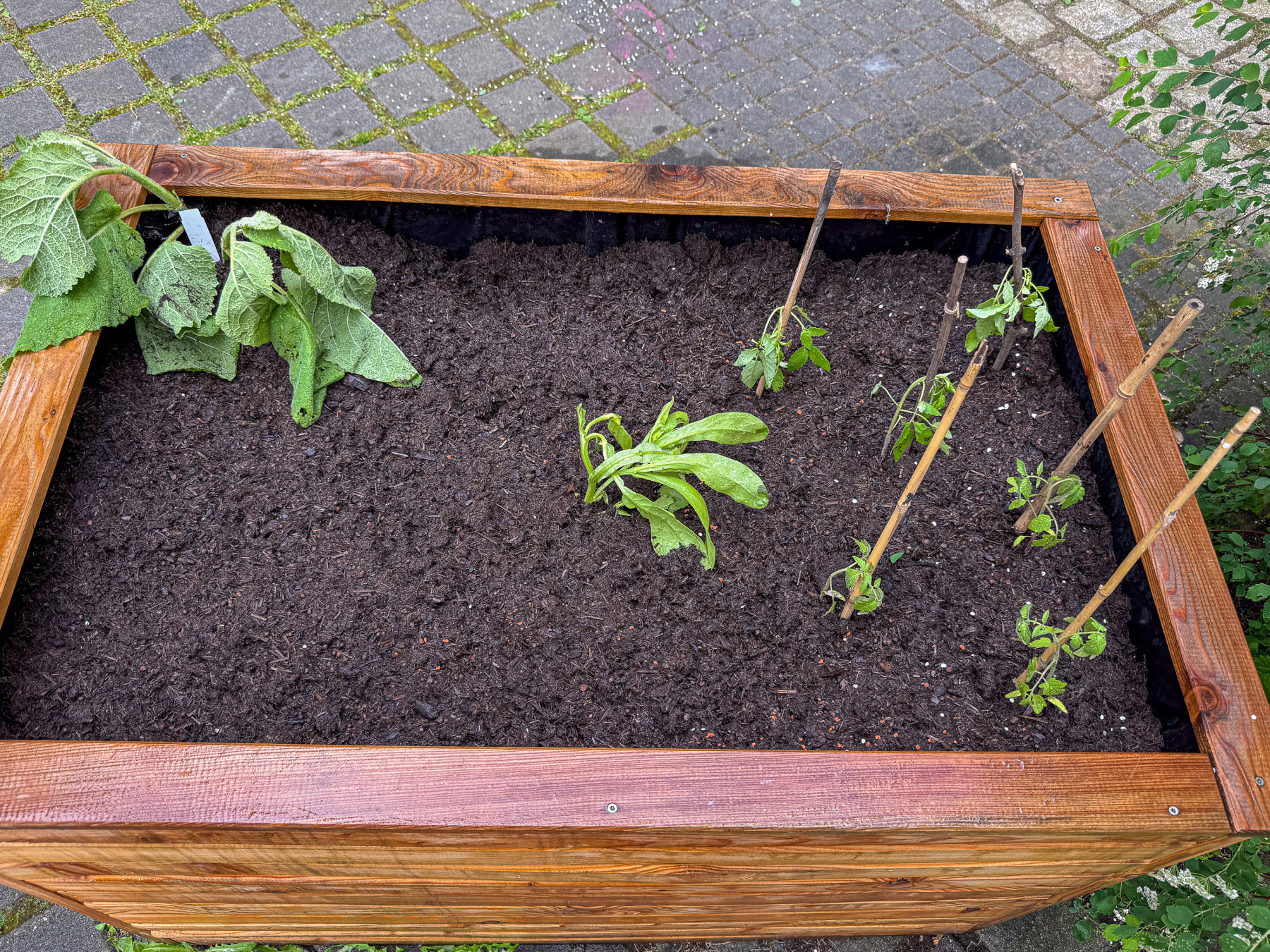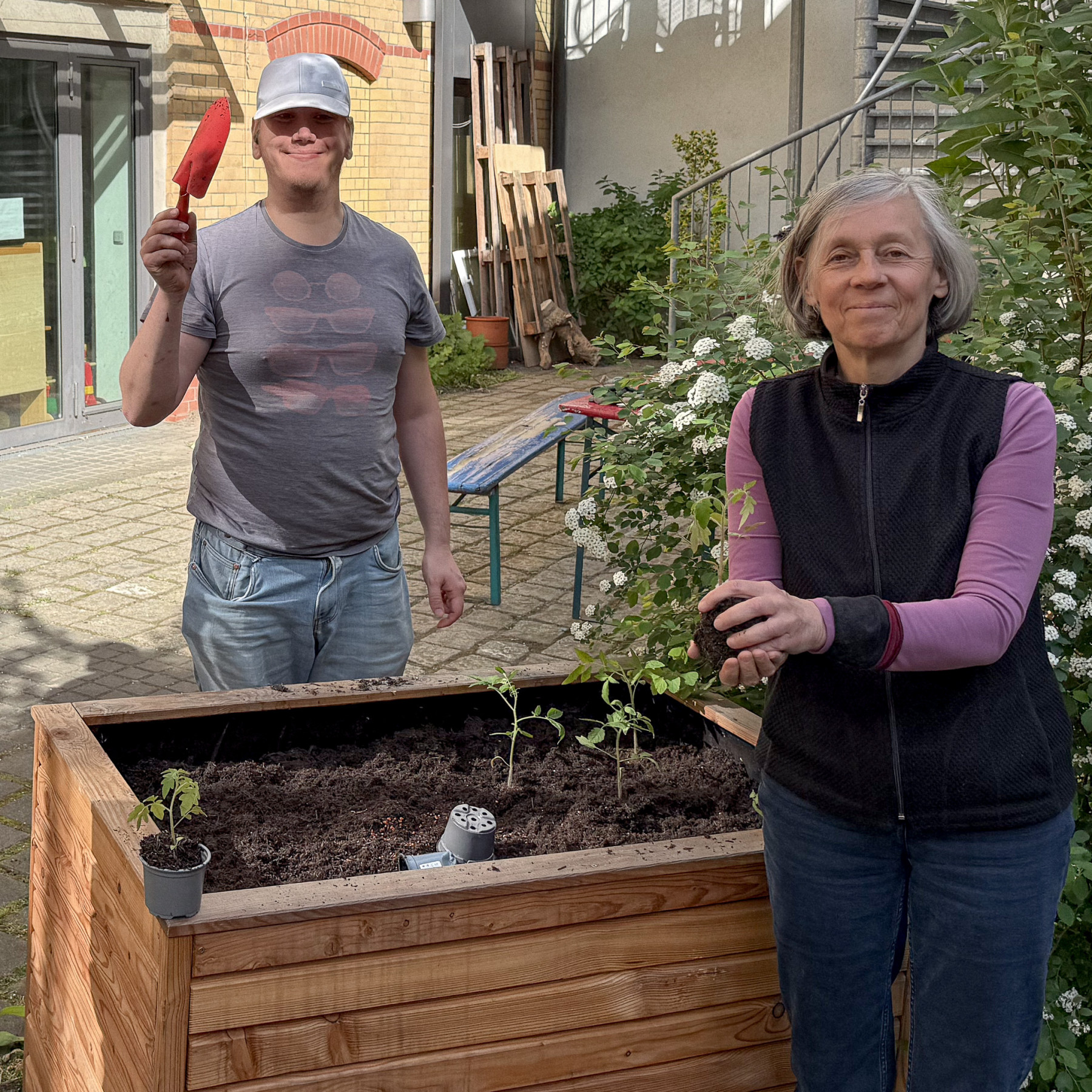 Im nächsten Schritt werden vorgezogene Tomatenpflanzen eingesetzt.