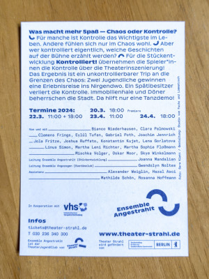 Diese Frage stellt das Theaterstück "Kontrolliert!" vom Ensemble Angestrahlt. Das ist das Jugend-Ensemble im Theater Strahl. Am 22. März 2024 schauten wir uns das Stück an - und gratulierten einem der Schauspieler zum Geburtstag. Er ist nicht nur Schauspieler, sondern macht auch bei unserem Projekt mit. Das Stück hat uns allen sehr gefallen. Es ist bunt, lustig, manchmal auch ernst und zeigt in eindrucksvollen Szenen, wie wir uns alle immer irgendwo zwischen Chaos und Kontrolle befinden.